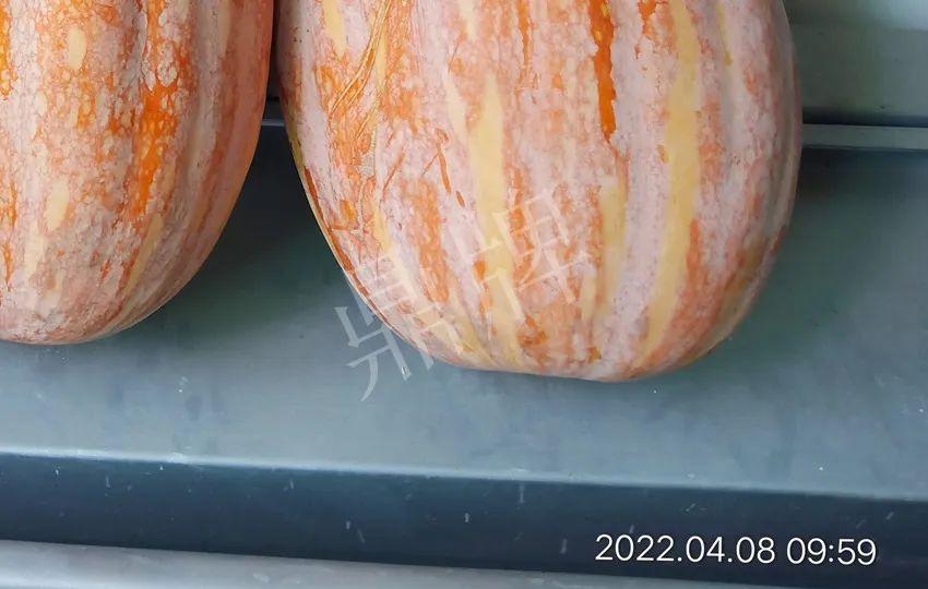 沒想到,“小胖墩”蜜本南瓜越存放越漂亮,瓜開始是粉黃色,到后面越來越紅亮(見前后照片對比)。李老板說,4月8日拍完照片后,家里吃了一個,比之前好吃了,甜度有增加,口感細膩。