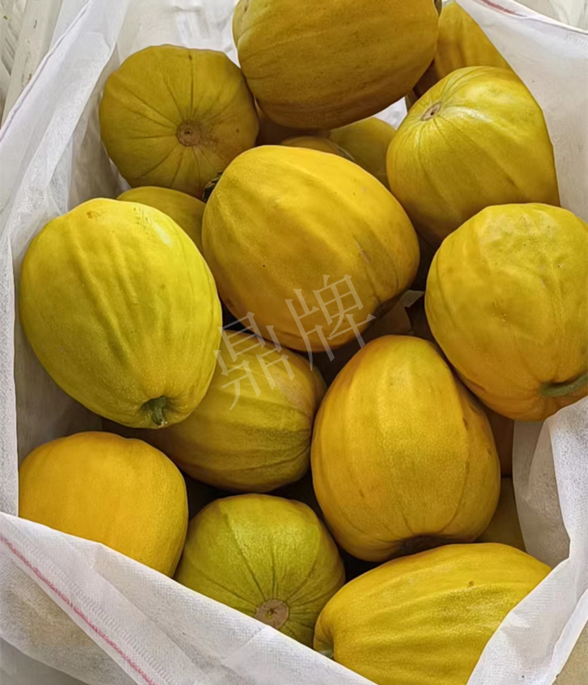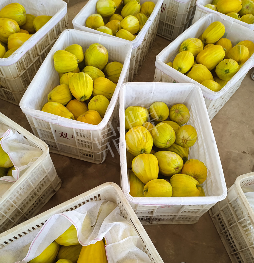 于是,我在今年春季種上了“秋甜1號”,今年共種了100多畝地的甜瓜,現在給大家分享的是抗高溫能力最強的“秋甜1號”。該品種果色金黃,果型端正,甜度高。到6月16日就大量上市了,此時批發價1.8元/斤。我們都是裝箱批發,一箱箱的瓜真是漂亮,根本不愁銷路。