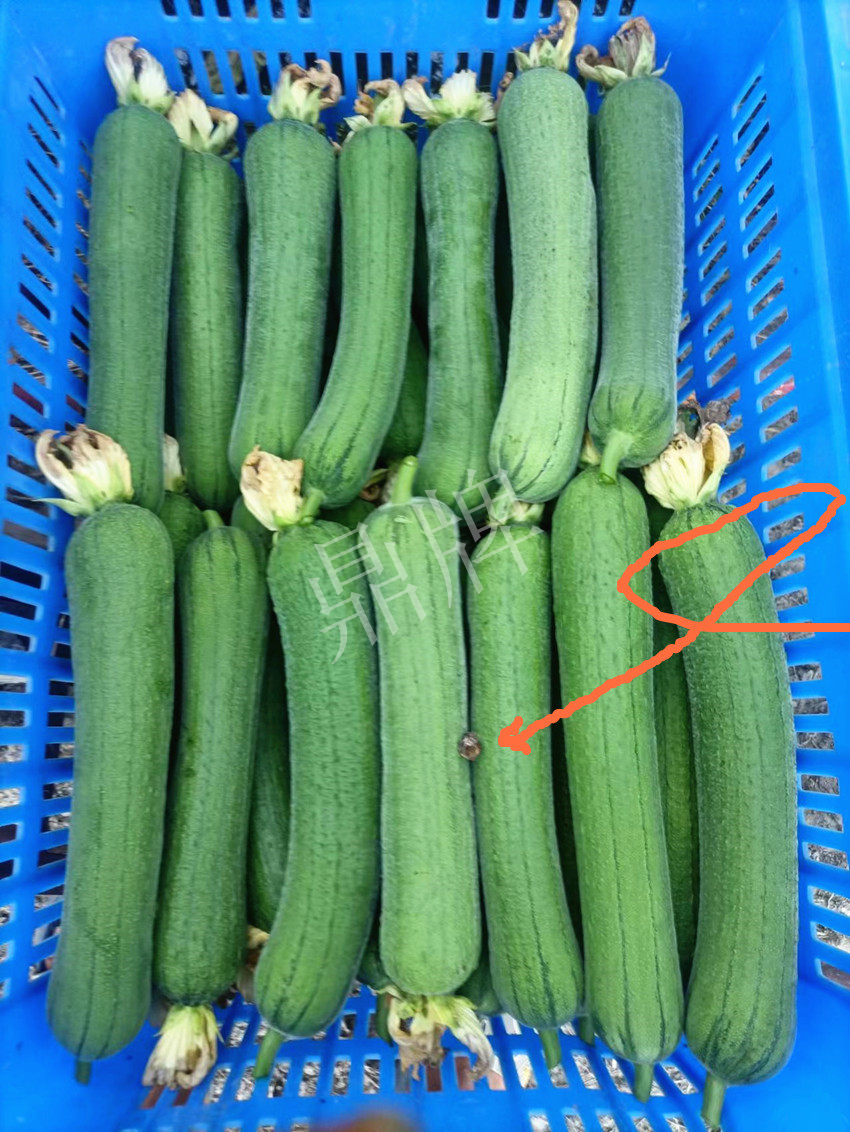 ▲ 裝入框中的“優比1號”絲瓜。請看紅箭頭…