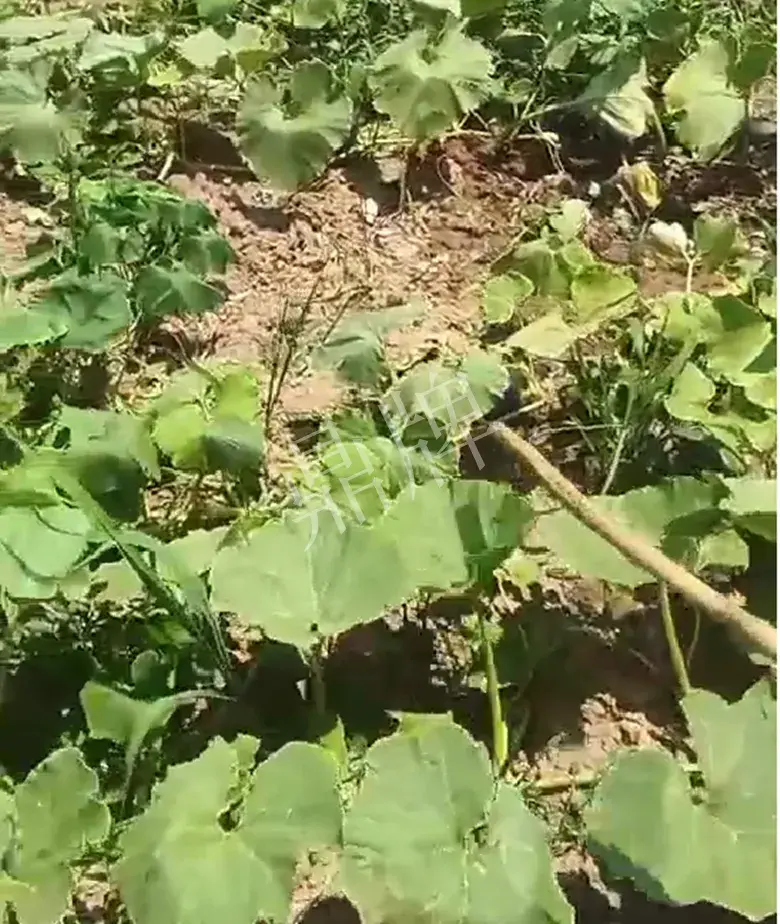 圖4,與“小胖墩蜜本”同時定植的“某貝貝南瓜”,我們可以看到其植株、葉片等都已經出現一定的枯萎和黃化。