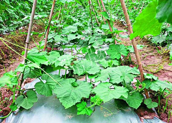 田間管理:去除所有側蔓,只留主蔓生長,為了減低坐果高度,主蔓向兩邊爬地后再上架,人字架交叉點離地面1.3米,便于果實膨大后自然垂落地面。